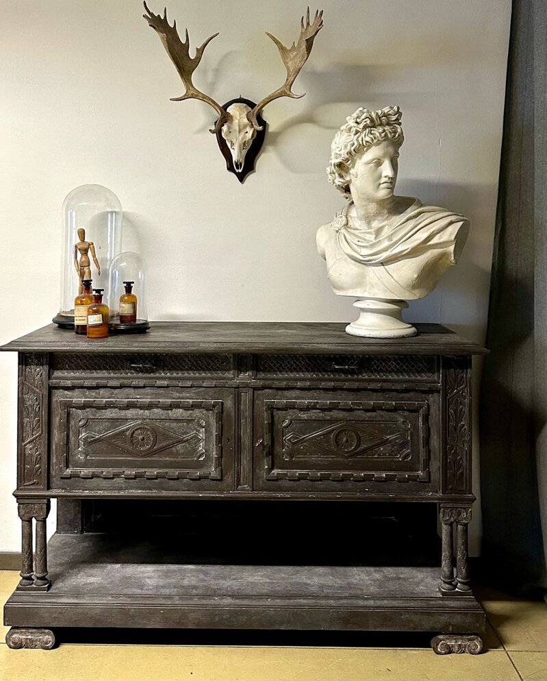 Buffet epoca fine ‘800, in stile rinascimentale. Legno massello laccato a mano con tempere naturali all’uovo e pigmenti.